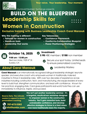 EMAIL INFO@HUMX.COM TO PURCHASE A TICKET TO THIS AMAZING SEMINAR. CAROL MARZOUK IS A NATIONALLY RECOGNIZED MOTIVATIONAL SPEAKER AND COACH FOR WOMEN IN CONSTRUCTION AND AFFLIATED FIELDS. LEARN NEW TOOLS FOR THRIVING AND OPTIMITIZNG YOUR TALENT AND MEET LIKE-MINDED WOMEN IN OUR INDUSTRIES.